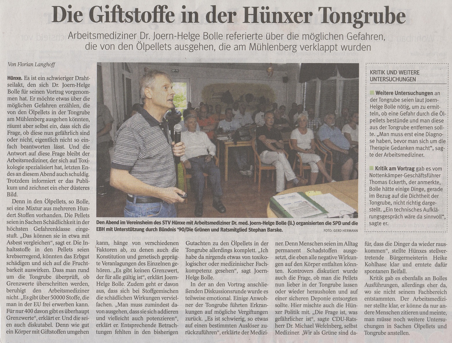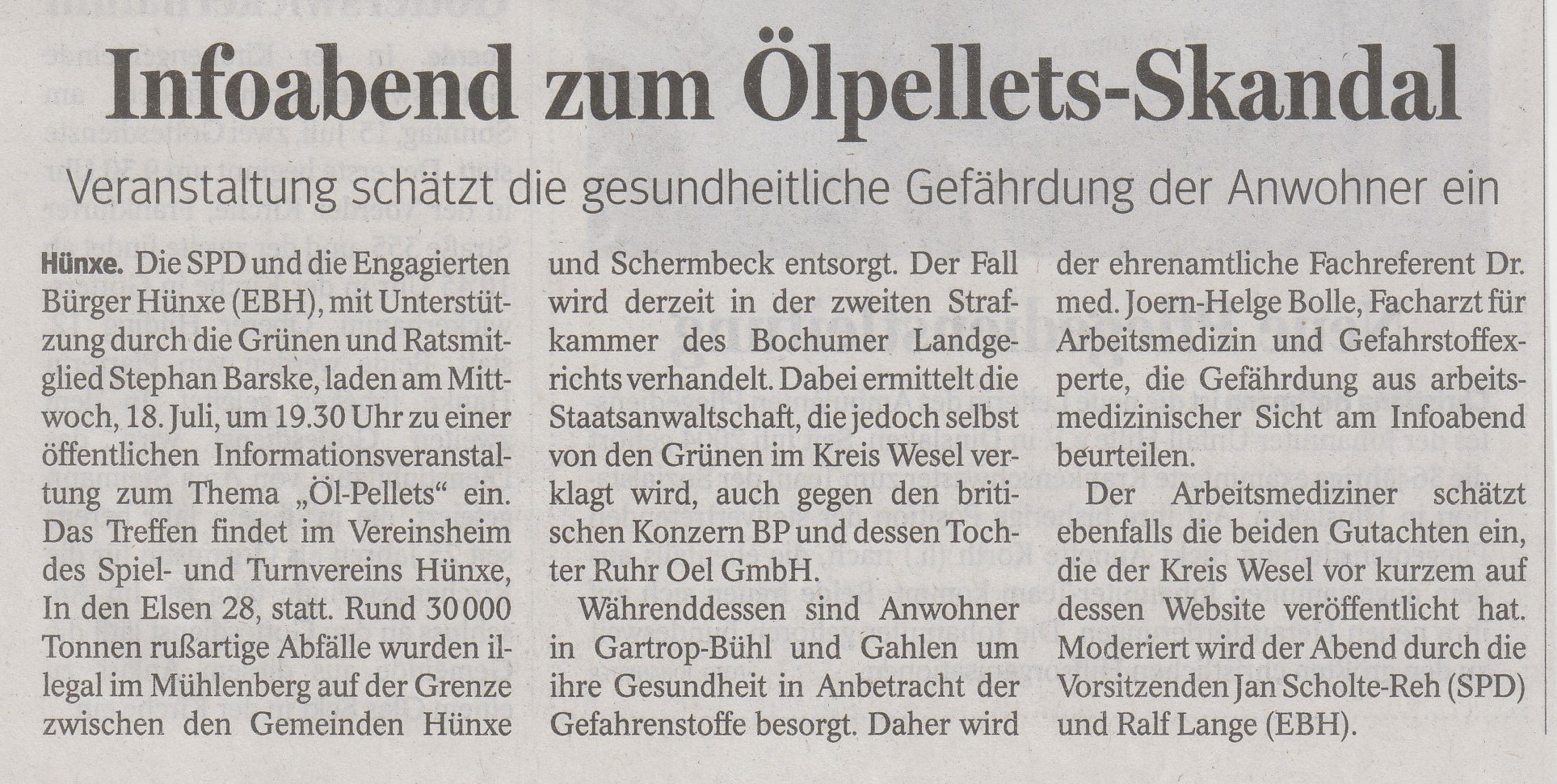 Bei der gut besuchten Infoveranstaltung am 18.07.2018 boten die SPD und die EBH den Bürgerinnen und Bürgern eine Plattform für eine öffentliche Information und Diskussion zu den gesundheitlichen Aspekten der illegalen Müllentsorgung. Die strafrechtlichen Fragen wurden nicht thematisiert. Der Referent, Herr Dr. Joern-Helge Bolle, präsentierte seine Einschätzung aus Sicht des Arbeitsmediziners und Gefahrstoffexperten und beantwortete die vielen Fragen und Hinweise aus dem Publikum.
