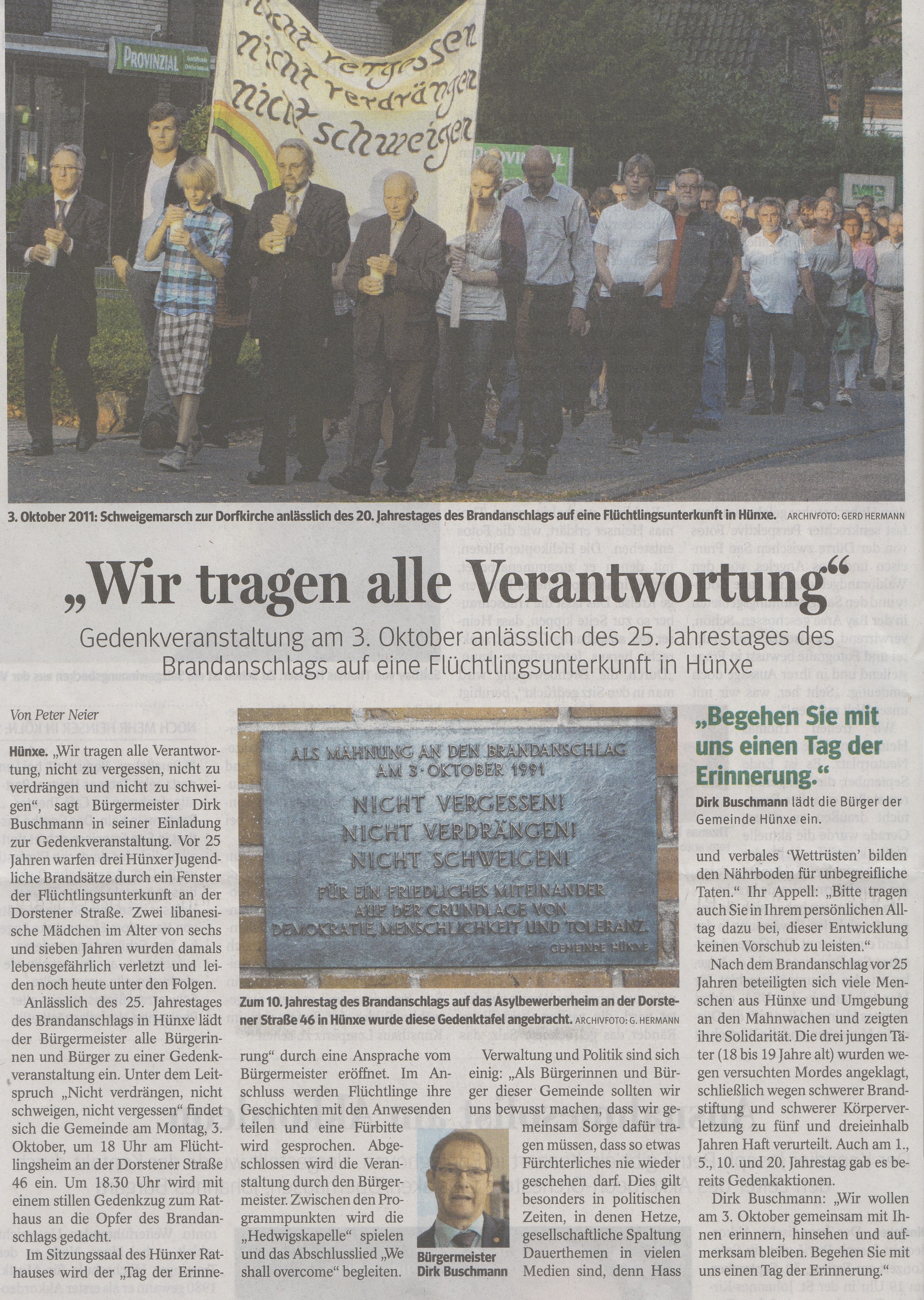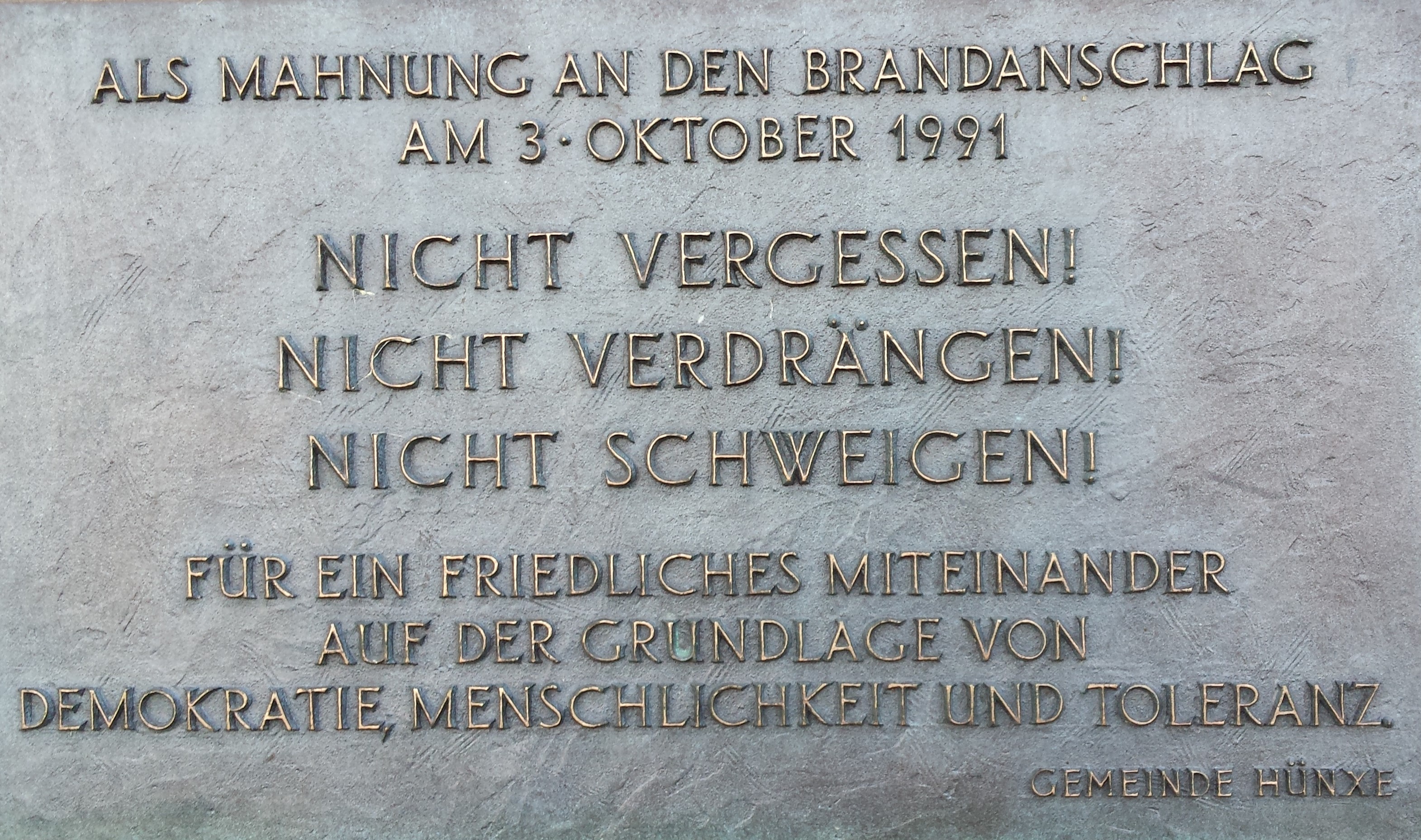 Am 03.10.2016 wird in Hünxe mit einem Gedenkzug durch den Ort und einer anschließenden Gedenkveranstaltung an den Brandanschlag vor 25 Jahren erinnert. In der Einladung des Bürgermeisters zu der Gedenkveranstaltung heißt es, „dass wir gemeinsam verantwortlich dafür sind, nicht zu vergessen, nicht zu verdrängen und nicht zu schweigen.“