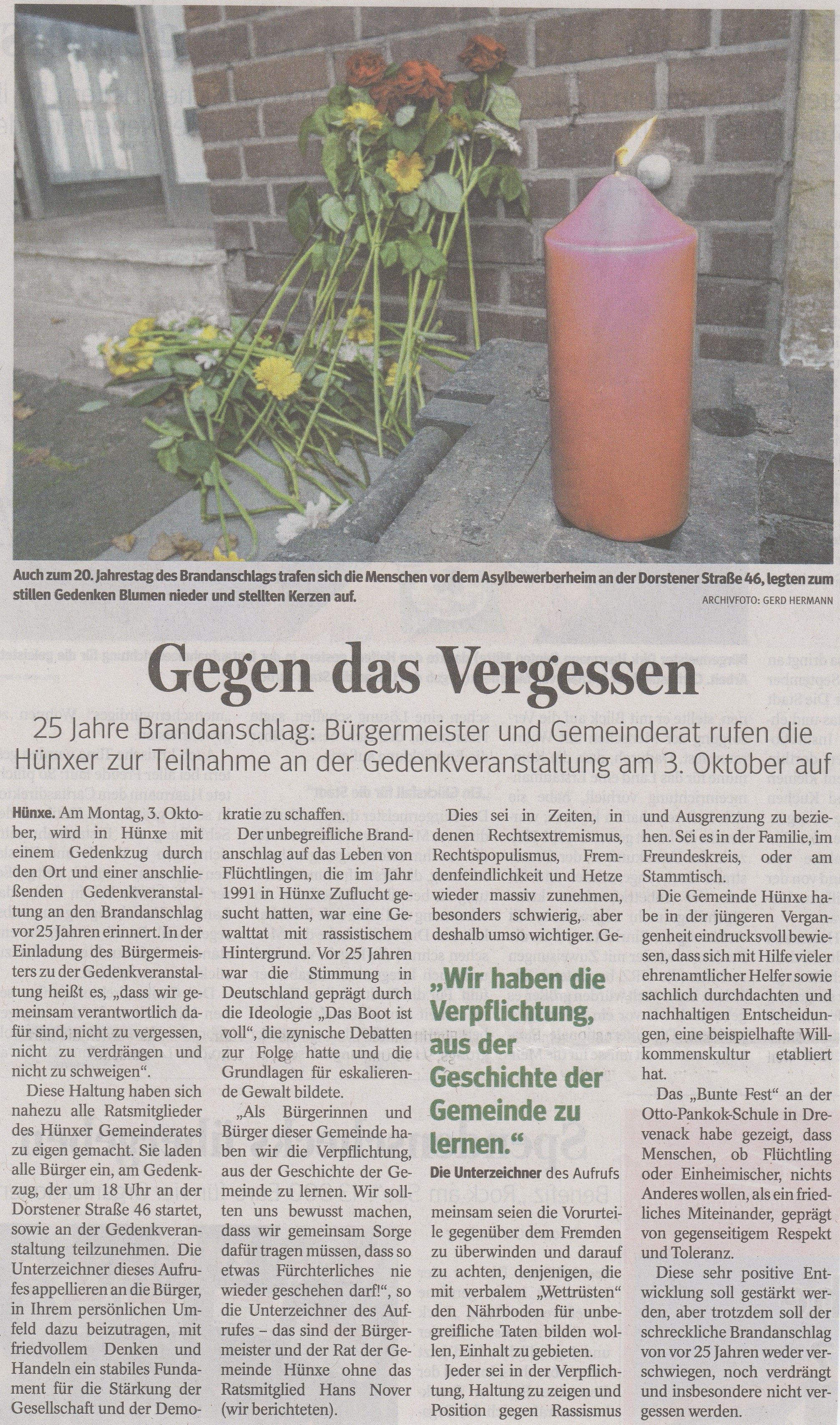 Der unbegreifliche Brandanschlag auf das Leben von Flüchtlingen, die im Jahr 1991 in Hünxe Zuflucht gesucht hatten, war eine Gewalttat mit rassistischem Hintergrund. Vor 25 Jahren war die Stimmung in Deutschland geprägt durch die Ideologie „Das Boot ist voll.“, die zynische Debatten zur Folge hatte und die Grundlagen für eskalierende Gewalt bildete.